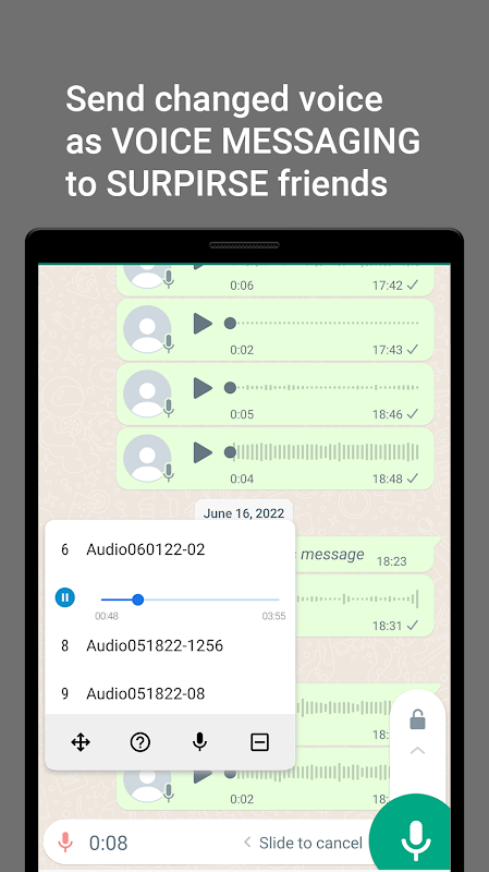 Fai finta di essere il tuo personaggio preferito e invia la tua voce cambiata attraverso la tua app di chat preferita (WhatsApp, Telegram, LINE, ecc.) per sorprendere i tuoi amici.