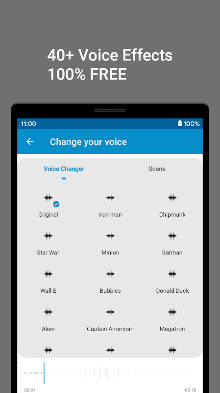 Super Voice Changer con effetti vocali divertenti può modificare le registrazioni vocali e i file audio con oltre 40 effetti audio ed effetti di scena, 100% GRATIS!💯. Puoi trasformare la tua voce in effetti di supereroi, robot, elio, scoiattolo, bambino, maschio e femmina. E invia la tua voce modificata come messaggistica vocale o condividila sui social media!