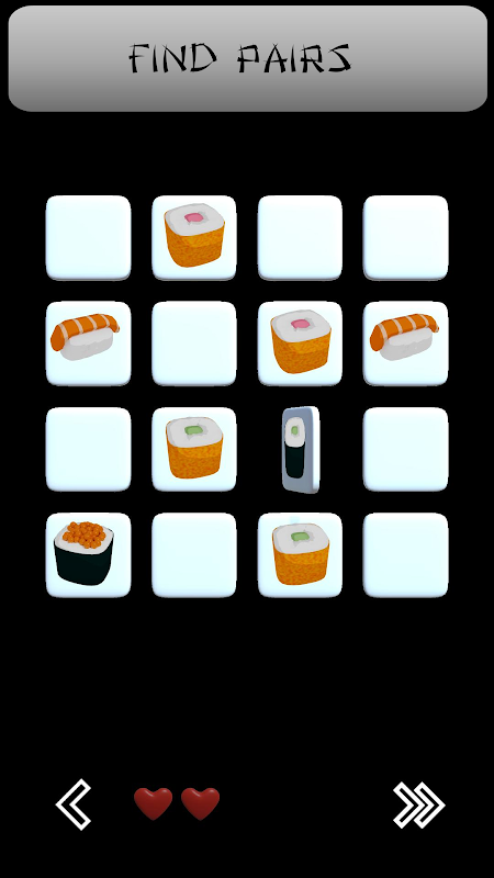 Some sushi dishes will be shown to you for a few seconds. You will have to remenber their position and find pairs once the tiles are face down.