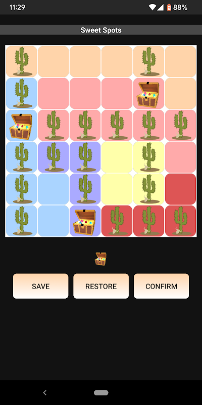 In ogni partita, si è di distribuire un numero fisso (1 o 2) di casse del tesoro per riga, ogni colonna e per zona colorata. I forzieri devono essere collocati in punti in modo che non scrigni sono row-saggio adiacente, colonna-saggio o in diagonale tra loro.