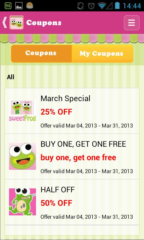 sweetFrog app uniquely blends a fun game with real life rewards. Be rewarded exploring the Sweet Frog land with Frogs Scoop and Cookie earning sweet rewards. Not a game fanatic? No problem! Just find your favorite sweetFrog yogurt stores and you will receive discount offers from your favorite locations. Easily locate sweetFrog stores, find the flavor you like and you can create your own recipe too!