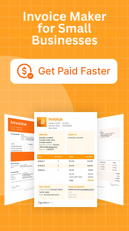 Swift Invoice Generator ti aiuta a creare fatture, bollette, preventivi e ricevute in PDF, puliti e professionali, in pochi tocchi. Che tu sia un libero professionista, un negoziante, un fornitore di servizi o una piccola impresa, questo potente generatore di fatture rende la fatturazione semplice e organizzata.
