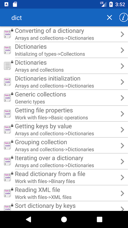 • Tutti gli esempi nell'applicazione sono disponibili offline. L'applicazione può essere utilizzata quando la connessione Internet non è disponibile.