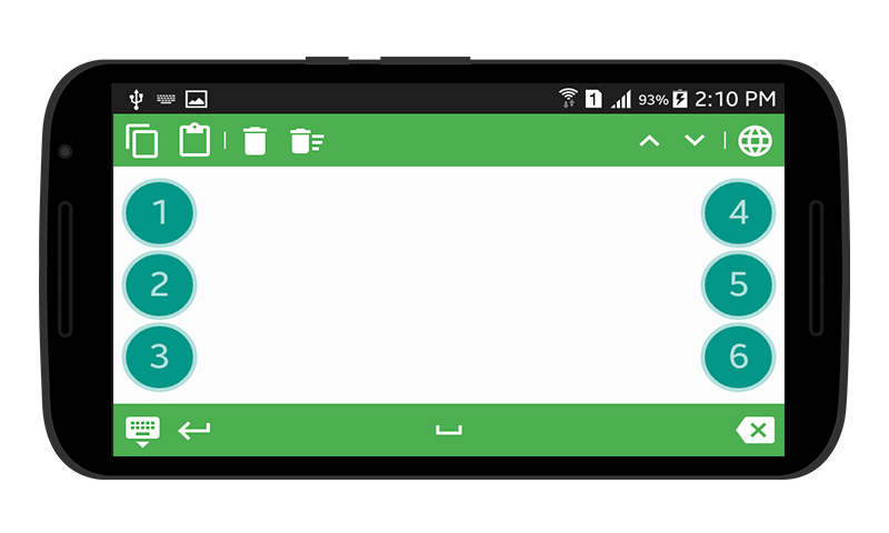 - L'utente può utilizzare questa tastiera in modalità verticale o orizzontale, poiché i sei punti Braille si trovano a sinistra e a destra dello schermo, come la cella Braille.