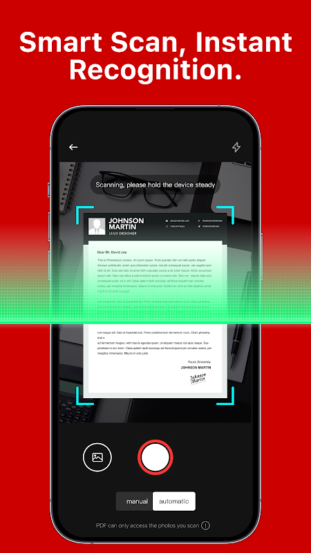 Scatta una foto o scansiona documenti multipagina all'istante. Perfetto per appunti, ricevute, fatture, contratti, lavagne e documenti d'identità. La nostra elaborazione avanzata garantisce PDF nitidi e chiari ogni volta.