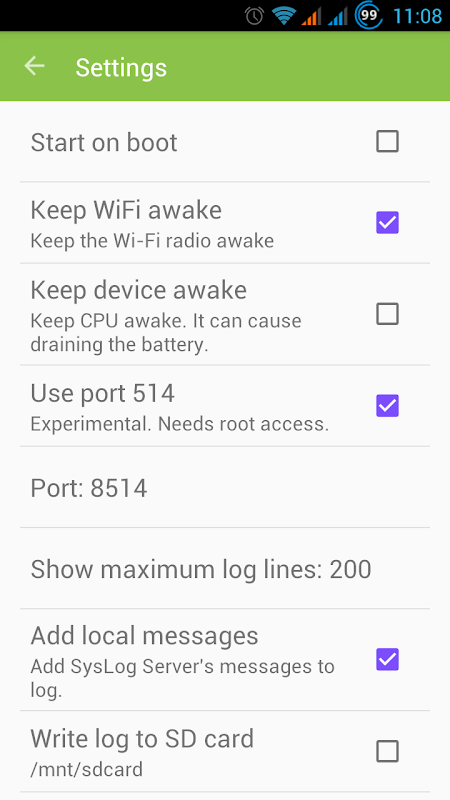 Note, that this server does not require ROOT permissions and can use ports greater than 1023. You can use 514 on a rooted device only.