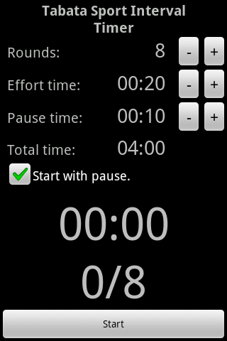 Set the number of rounds, seconds of effort, seconds of pause and start training.