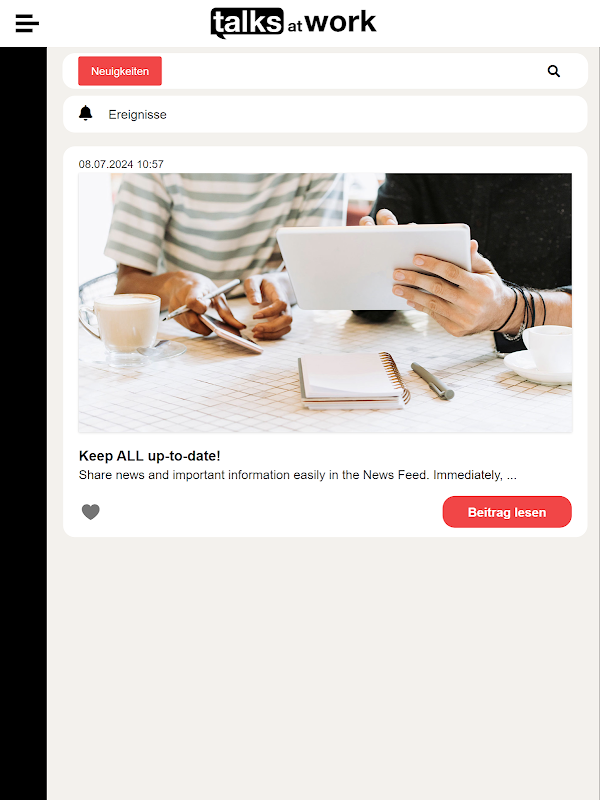Ottieni l'app della community "talks at work" e fai rete con altri game changer per rivoluzionare il futuro della comunicazione aziendale interna ed esterna. Presenta le tue competenze nel Business Hub, condividi le offerte di lavoro aperte e altre notizie sulla tua azienda. Approfondisci la tua rete attraverso lo scambio diretto nella chat, beneficia di approfondimenti esclusivi sugli argomenti di tendenza di domani! Inoltre: partecipa ai nostri eventi esclusivi e agli incontri di rete. Candidati ora su talksatwork.com/community e proteggi i tuoi dati di accesso esclusivi per l'app.