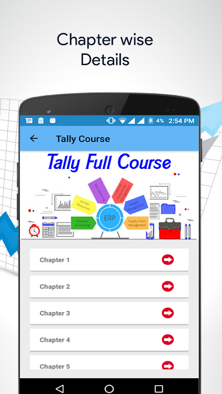In our app you will get Tally ERP 9 Chapters from 1 to 8 and also the Keyboard Shortcuts.