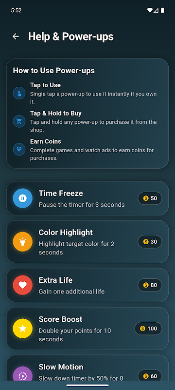 Usa le monete guadagnate durante il gioco per acquistare potenti abilità come il blocco del tempo, l'evidenziazione a colori, vite extra o moltiplicatori di punteggio.