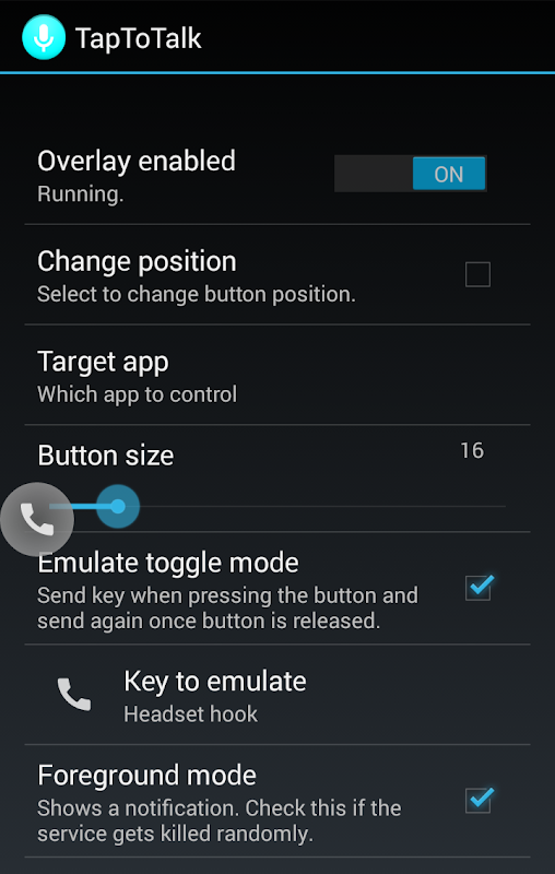 With TapToTalk, you can control other apps with a virtual Push-To-Talk button (PTT). TapToTalk displays a permanent button that you can use no matter which app you are currently using.