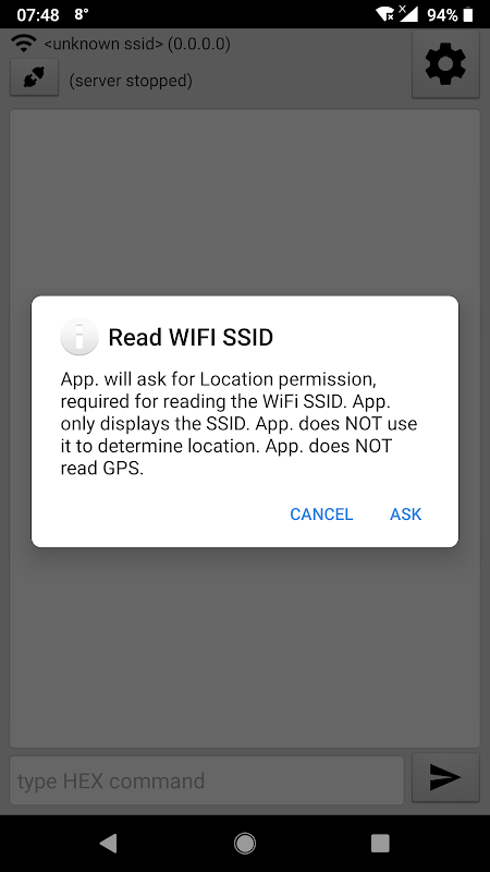 Server mode: app starts a server (on device's IP) and waits for client to connect on specified port.