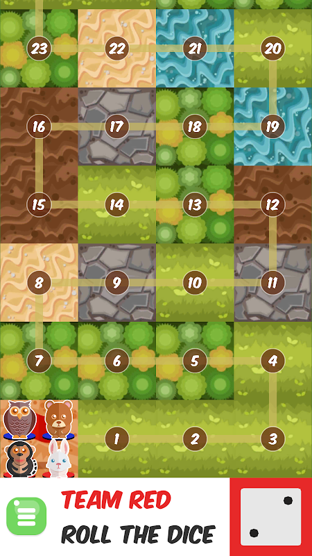 Manage your team of animals to complete all the levels. You may choose a raccoon or a fox, a rabbit or a mouse , a wise owl or a powerful bear. Make a team of two animals for each map and battle the opponent to finish the first. Each turn roll the dice and choose one animal to move. When landing on an occupied tile, depending on it's strength, your animal can remove the opponent or be sent to start.