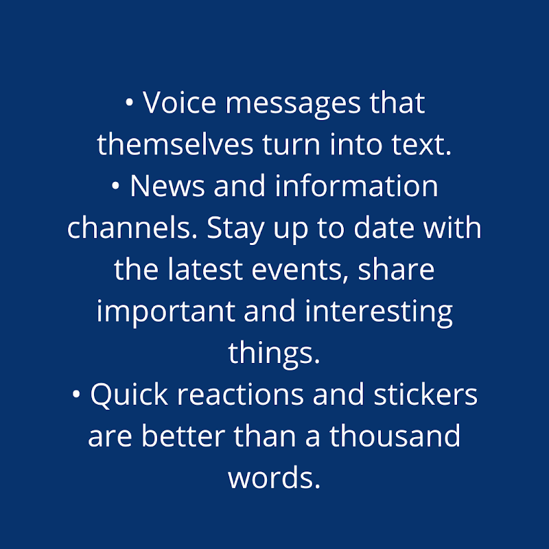 • News and information channels. Stay up to date with the latest events, share important and interesting things.