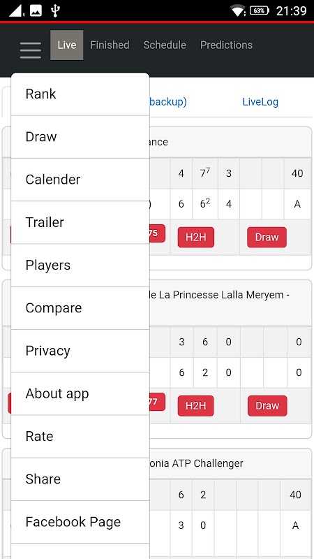 1- Punteggio in diretta, programma, partite finite, video in evidenza, confronto di giocatori, pareggi, calendario, classifica, registro dei punteggi in diretta (cronologia).