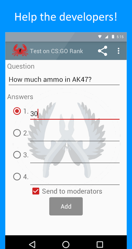 -Прохождение теста на теоретические знания о Counter-Strike Global Offensive из регулярно обновляемой базы данных количеством в 60 вопросов;