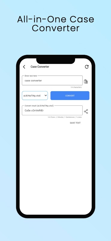 Text Case Converter è un'app semplice e leggera che ti aiuta a convertire istantaneamente qualsiasi testo in minuscolo, maiuscolo, maiuscolo/minuscolo corretto o maiuscolo/minuscolo, il tutto con un solo tocco.