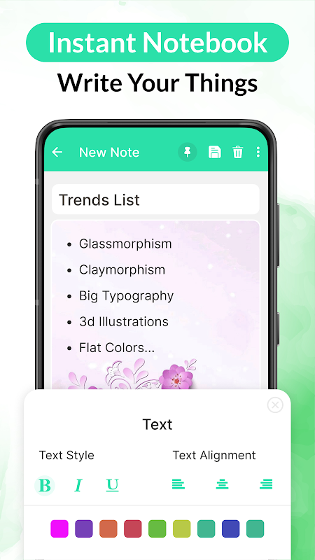 Quaderno tascabile per scrivere e salvare i tuoi testi all'istante. Con questa app puoi scrivere o arruolare qualsiasi cosa sotto forma di testi in una volta. E puoi accedervi ovunque senza Internet e anche in modalità offline.