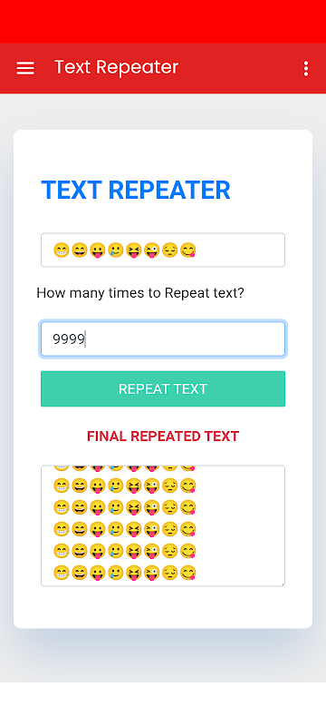 Ripetitore di testo ti offre un'opzione migliore per ripetere il testo secondo le esigenze. Ripetitore di testo supporta emoticon e testo speciale per la ripetizione. Questa app è più divertente per i ragazzi che scrivono sempre il testo ripetuto per gli SMS. Non è più necessario scrivere solo perché il nostro Ripetitore di testo offre molte funzionalità per te. Ecco i principali vantaggi dell'app Ripetitore di testo.