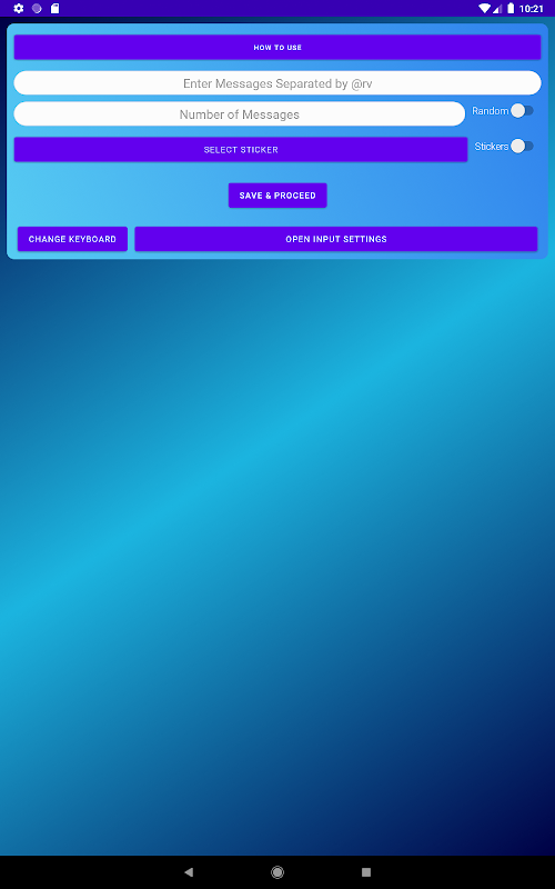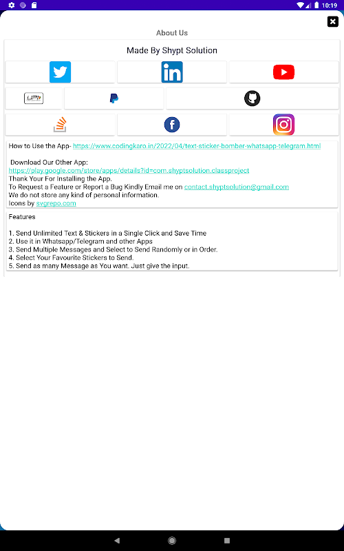 Send Unlimited Text and Messages on Whatsapp, Telegram & etc. with a single Click. Type the message you want to send or select the stickers you want to send and just set the number of messages to be send and you are all done. With a single click now you can send non stop messages to anyone of your friends and prank them.