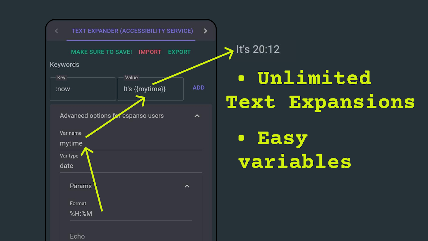 Questa app utilizza l'API di accessibilità per rilevare se è stato digitato un collegamento salvato e sostituirlo con una frase corrispondente.