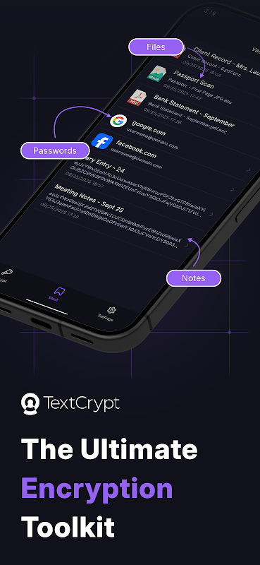 • La tua chiave segreta non lascia mai il tuo dispositivo. TextCrypt non può accedere, leggere o recuperare le tue note private o i tuoi file crittografati: totale indipendenza per il tuo Secure Vault.