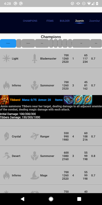 * Mostra i caratteri in una tabella che possono essere ingranditi, rimpiccioliti. Ordina i caratteri in base a nome, costo, danno, salute, ecc ...