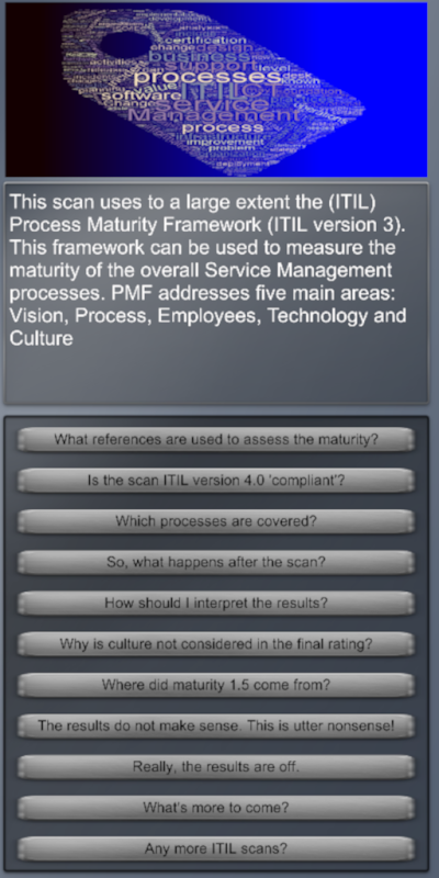 The 5-minute IT Process Maturity Scan can be used to assess the maturity of each of your IT-processes or ITIL processes. It provides guidance where focus could/should be in relation to further developing one or more of your IT or ITIL processes. Use the results to start an open discussion with those involved and (of course) the decision makers. Determine together if the organization will actually be better off by addressing some of the points mentioned in the outcome. And then collaboratively work out a proper approach.
