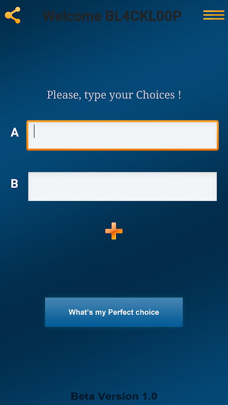 The User just has to type his/her Choice/Decision in the text boxes addressed for that purpose and hit the "What's my Perfect Choice" button ! You will be asked to wait, for your Perfect Choice, for a few seconds (5 seconds) then The App will reveal to you what your best and perfect Choice would be !