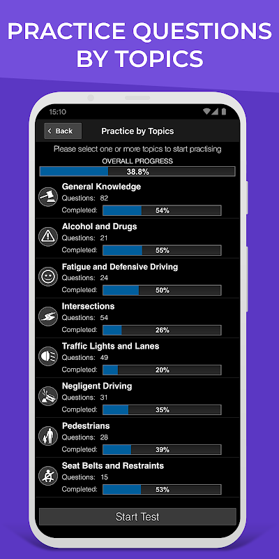 È possibile selezionare una o più categorie di praticare. È inoltre possibile eseguire test rapidi per 10, 20 o 30 domande.