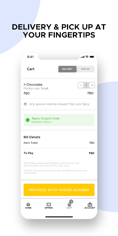 * Ordina in o scegli di asporto: puoi selezionare l'opzione di consegna o selezionare da asporto per ritirare tu stesso l'ordine.