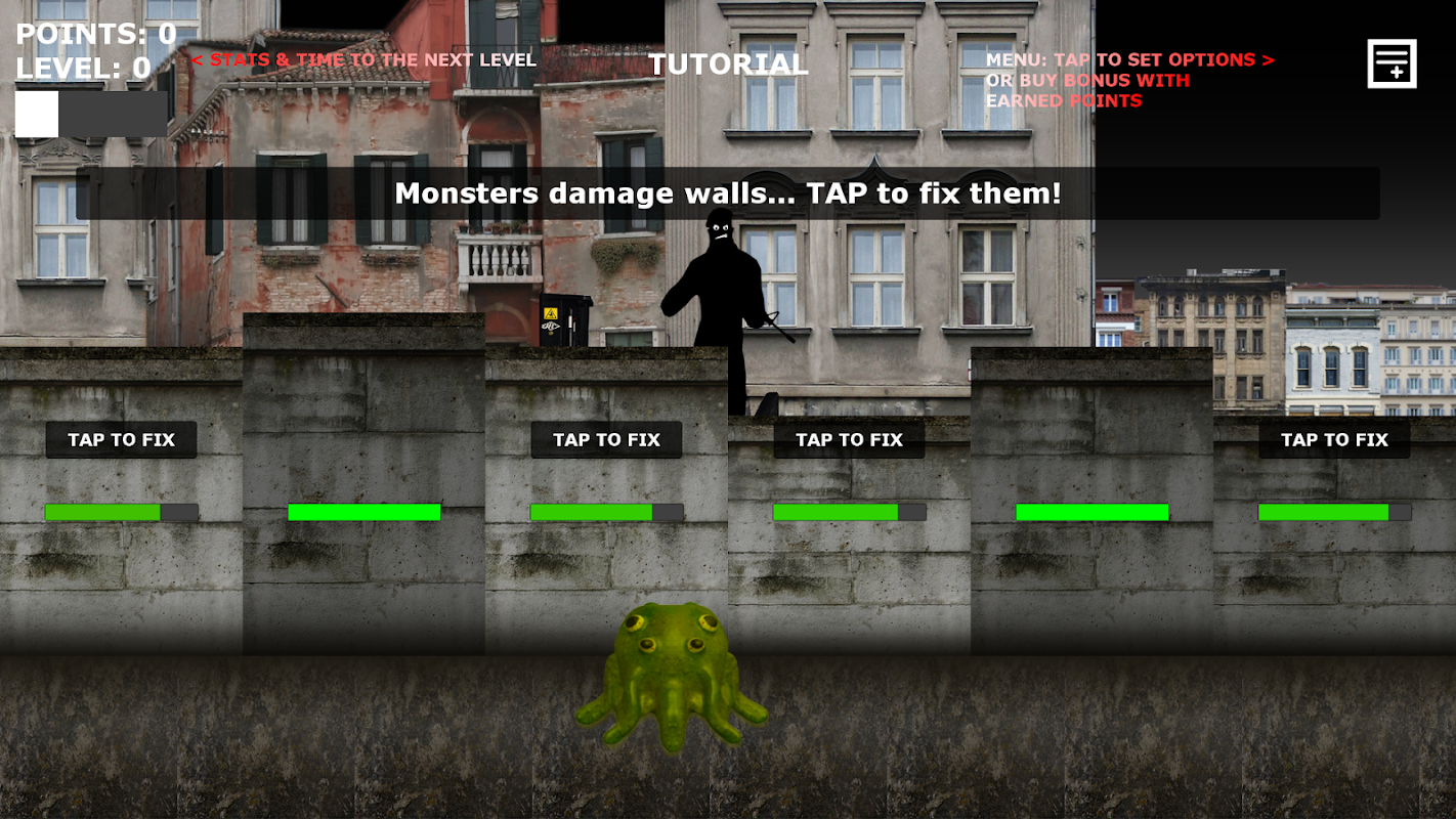Earn points to fix walls and to buy items (bombs, alarms, etc...)