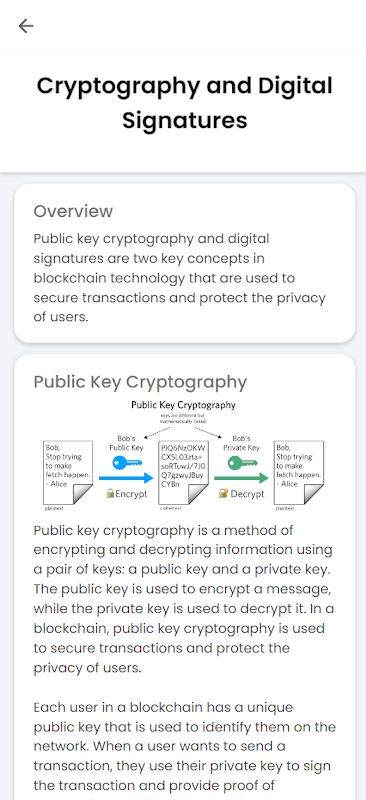Ogni giorno, l'app offre una nuova lezione su un diverso argomento correlato al Web3, come la tecnologia blockchain, i contratti intelligenti o le applicazioni decentralizzate (dApp). Le lezioni sono interattive e coinvolgenti, utilizzando una varietà di elementi multimediali per aiutarti a comprendere i concetti trattati.