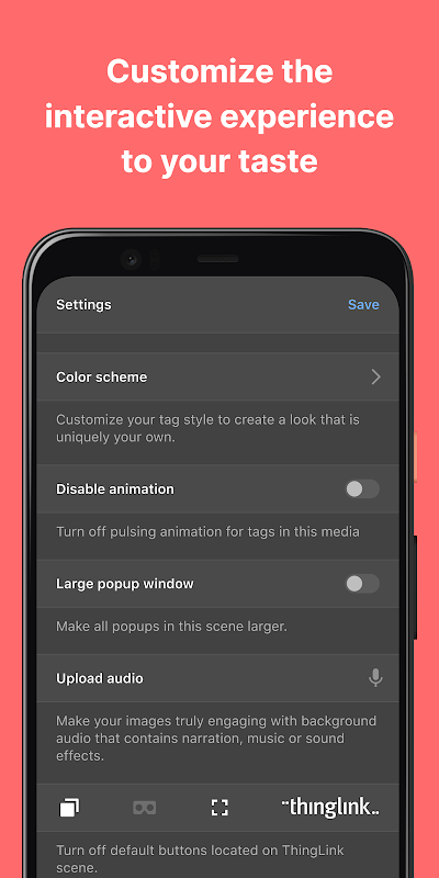Aggiungi note di testo e audio, link, quiz, app Google e altri incorporamenti da siti web, immagini e video agli hotspot. Aggiungi transizioni da una scena all'altra, cambia icone, regola i colori, persino registra l'audio direttamente in un tag o in modo che venga riprodotto quando l'immagine viene visualizzata!