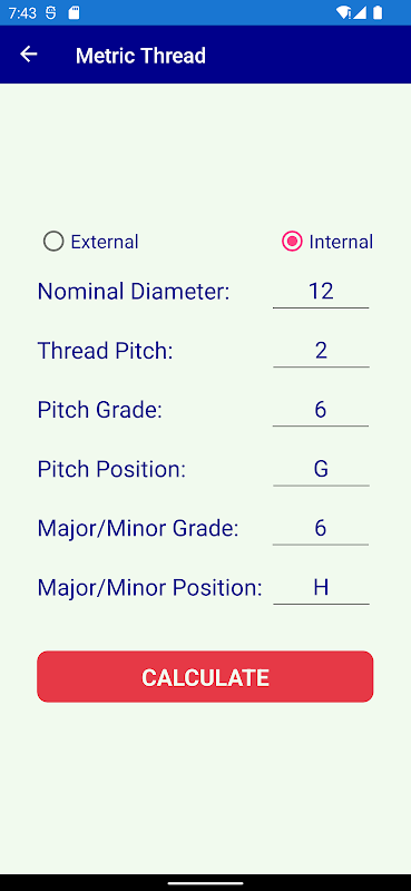 Indicando la dimensione e il passo della filettatura, l'app calcolerà tutte le dimensioni necessarie per il profilo della filettatura come il diametro del passo maggiore, minore.