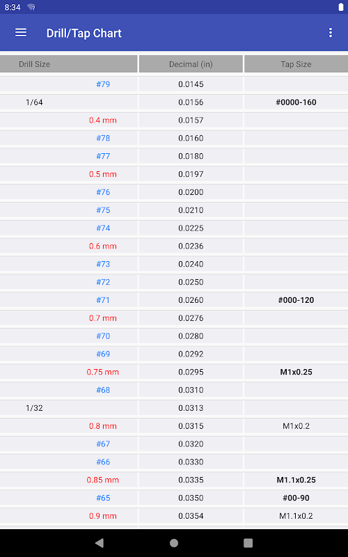 Contiene tutte le informazioni per maschi metrici e UN, filettature fini/corsi, dimensioni di foratura/maschiatura, dimensioni di maschi per tubi e dimensione della filettatura.
