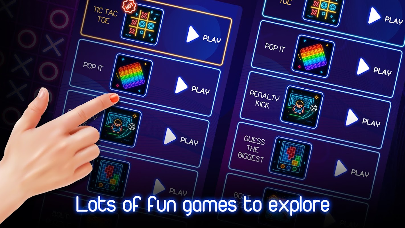 ✅ Raccolta di minigiochi 1 contro 1 per 1 o 2 giocatori: oltre al nostro gioco principale, c'è il classico Tris Glow. Ci sono molti giochi divertenti e rilassanti per 1 o 2 giocatori come: Scacchi; Dominio delle tessere; Puzzle con blocchi; Ping pong; Perni a vite; Bowling ecc. Dai puzzle alle classiche sfide in stile arcade, troverai ore di divertimento. Goditi una varietà di divertenti giochi offline con XO Tic Tac Toe: Hub di minigiochi 1 contro 1!
