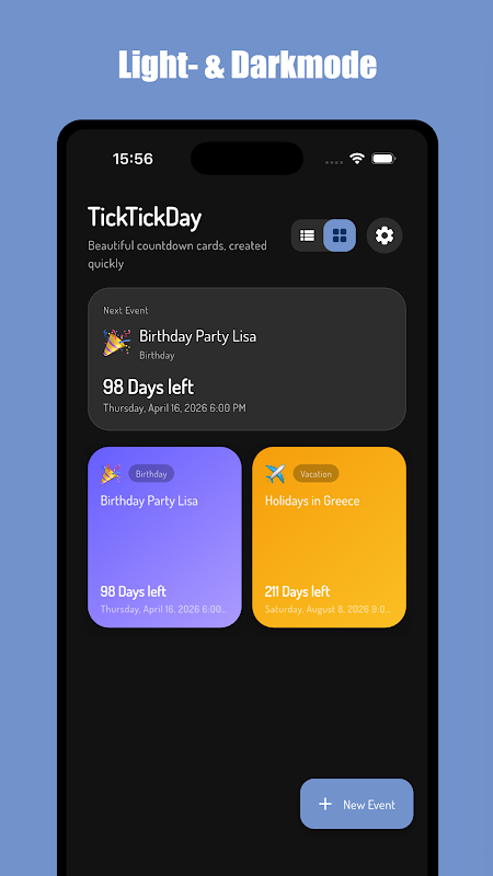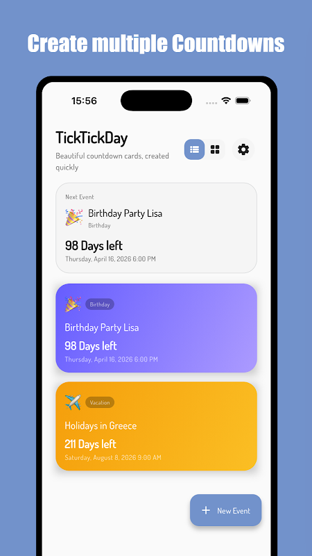 Non perderti mai più un evento importante! TickTickDay ti aiuta a creare e tenere traccia dei conti alla rovescia per compleanni, vacanze, matrimoni, esami e tutti i tuoi momenti speciali.