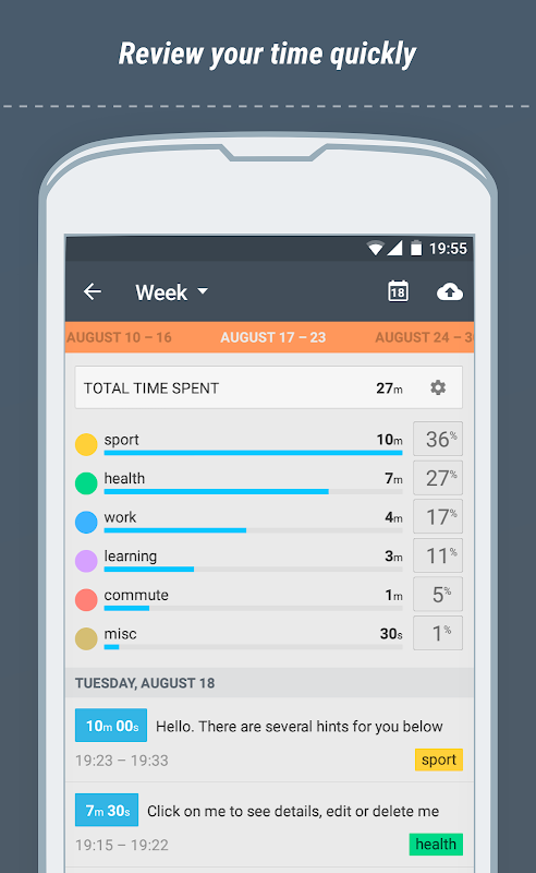 Come ogni inseguitore momento, questa applicazione consente di tenere traccia del tempo dedicato a compiti, i progetti e le attività (affari personali o attività aziendali, riunioni di lavoro o sport, o pendolari). Non vi chiederete più: "Quello che ho fatto la settimana scorsa?"