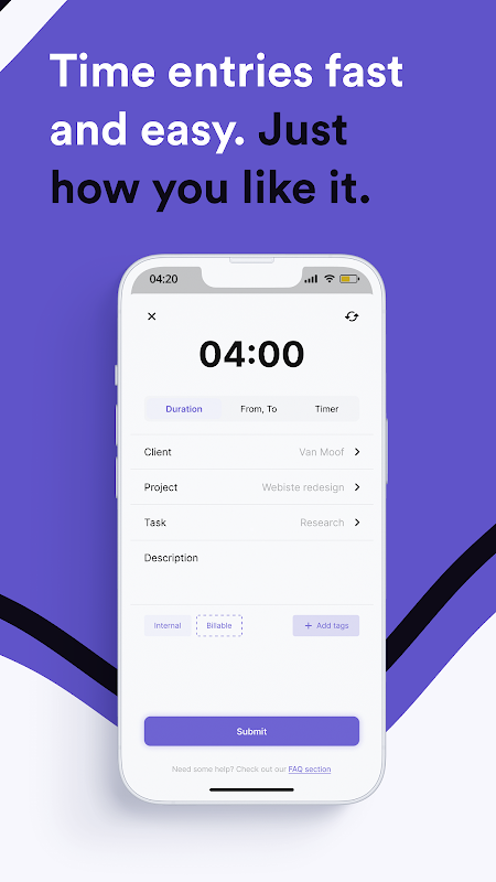 Scrivi facilmente ore per clienti, progetti, attività ed etichette. Imposta lo strumento nel modo desiderato. Inserisci le tue ore o lascia che TimeChimp calcoli le tue ore in base all'ora di inizio.