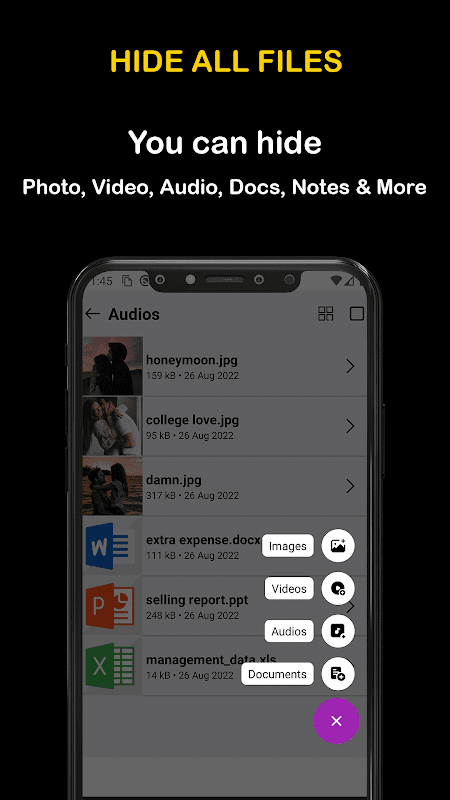 - Nascondi video, audio, immagini, contatti, file di documenti, note e altro.