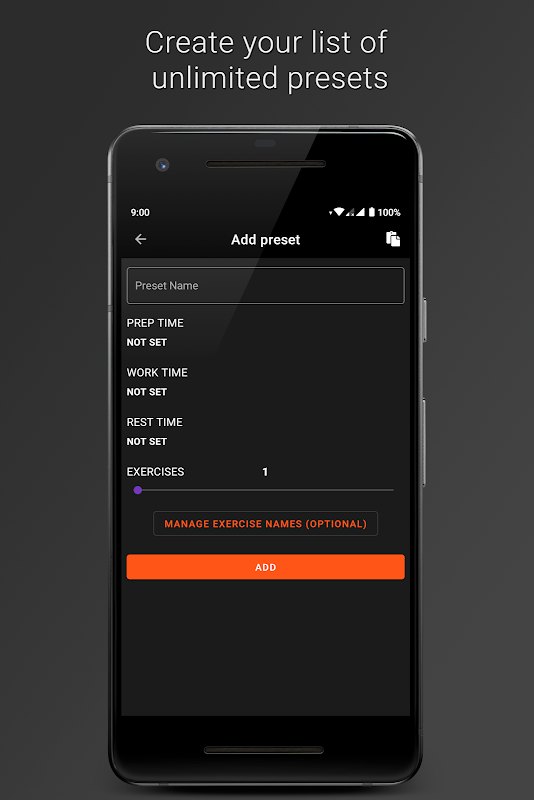 Oltre ad avere preset predefiniti, avrai anche la possibilità di creare e salvare i tuoi preset. Devi scegliere il tempo di preparazione, cioè il tempo necessario prima dell'inizio di una ripetizione, quindi scegliere il tuo allenamento e il tempo di riposo. Hai anche la possibilità di nominare i tuoi esercizi, in modo che mentre il timer è ticchettio ti mostrerà l'esercizio corrente e anche quelli imminenti.