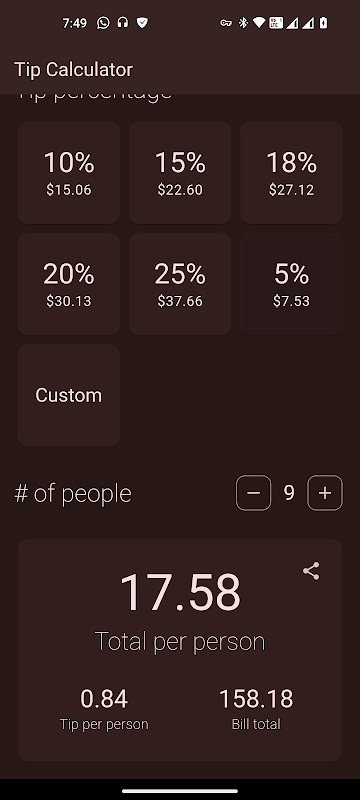 Impostazioni personalizzabili: regola le percentuali di mancia e personalizza il numero di persone con cui dividere il conto.
