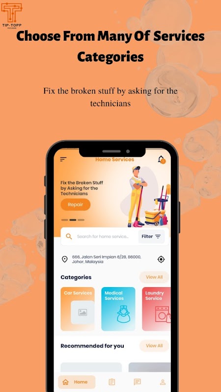 Tip-Topp è app di servizio su richiesta! Abbiamo adottato più misure per garantire un'esperienza di servizio igienico nella sicurezza della tua casa o del tuo ufficio. I nostri professionisti indossano mascherine, guanti e igienizzano tutte le attrezzature prima del servizio. Attraverso l'app, puoi prenotare servizi a casa o in ufficio, dalla bellezza e benessere per donne e uomini, alle riparazioni e manutenzioni domestiche, come la manutenzione dell'aria condizionata, l'elettricista, l'idraulico e il falegname. L'elenco completo dei servizi a domicilio e in ufficio è il seguente: