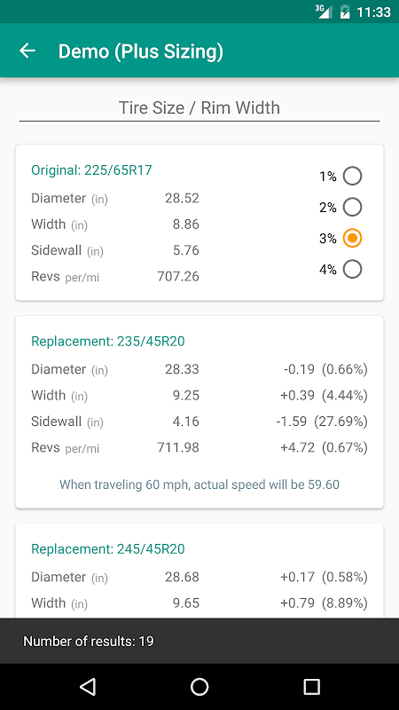 Inoltre, le dimensioni consentono di inserire la dimensione del pneumatico originale e la nuova larghezza del cerchio per vedere le dimensioni suggerite vicine al diametro originale.