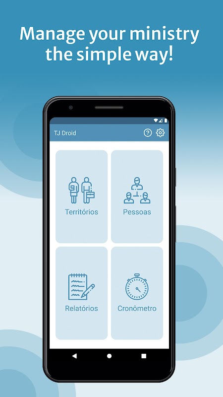 Con TJ Droid organizzi, cronometra e gestisci l'intero rapporto di servizio. Strumento creato per aiutare i Testimoni di Geova, TJ, in portoghese brasiliano, nel loro servizio di volontariato.