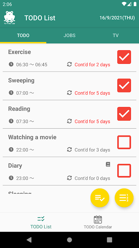 ・ Se tocchi il pulsante "✔" in basso a destra, verranno controllati tutti gli TODO del giorno.