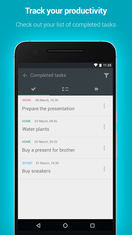 – Completed tasks. Sometimes there is so much you do during the day that few days later it is hard to remember what have been done already and what is still on the visual planner. With To Round to-do list app, you can see your finished tasks in just one-click – simply press the checkmark button in the header menu and you will get the full list of accomplished tasks.