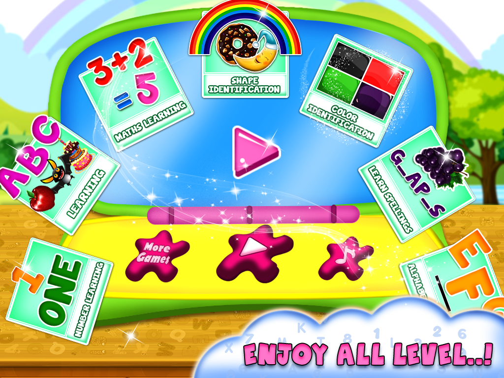 * Different fun educational activity like Abc learning, number learning, shape learning, color learning and maths learning with beautiful graphics and voice.