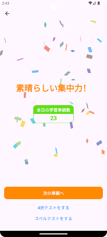 Le parole che hai sbagliato ti verranno chieste nuovamente alla fine del test e, rivedendole subito dopo, riuscirai a ricordarle con fermezza! È facile da seguire, quindi è perfetto per imparare nel tempo libero.